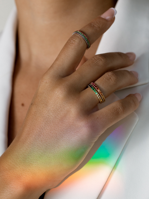 Zarte Ringe, in 18 kt Gelb-, Rosé- oder Weißgold mit Smaragde, Rubine oder Saphire besetzt.
