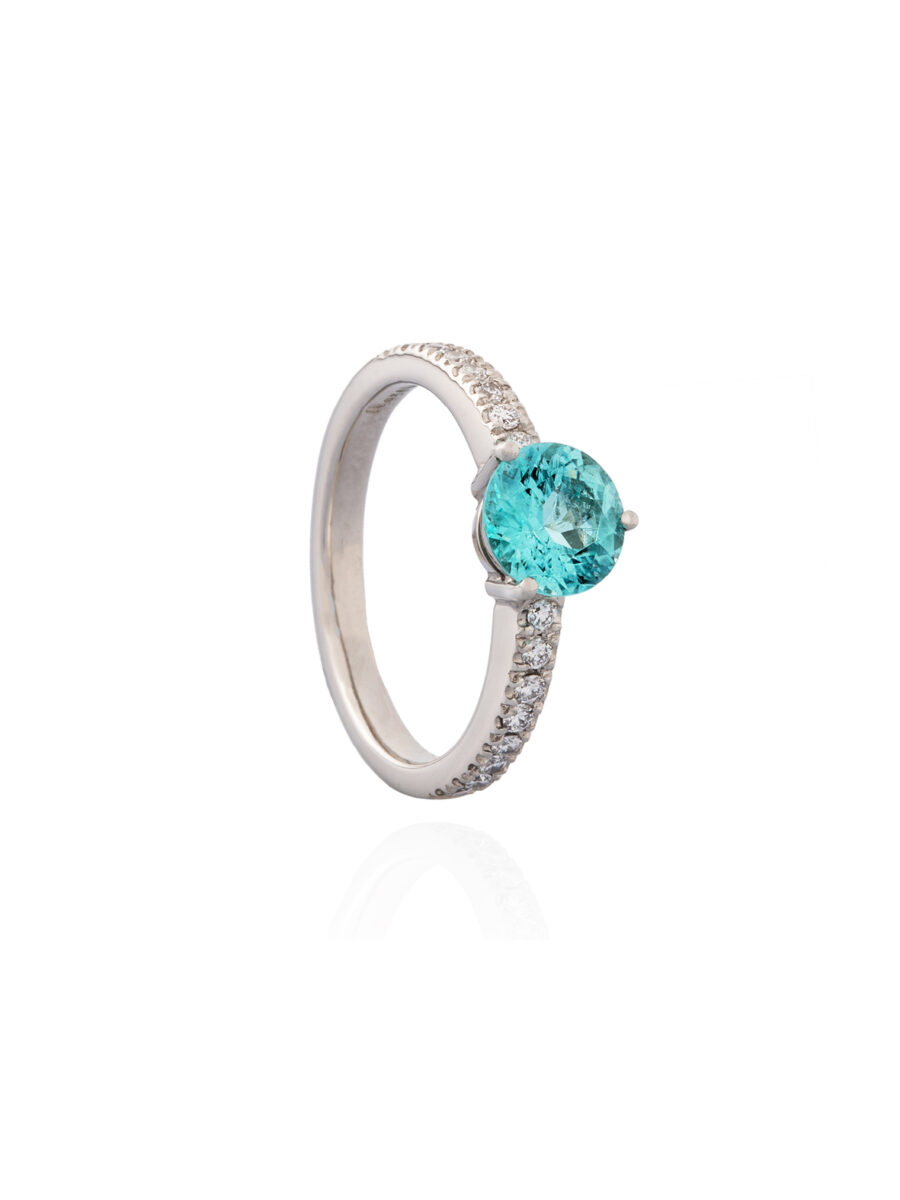 Ring mit Paraiba-Turmalin in seltenen Naturfarben, brillantenbesetzte Platin-Schiene